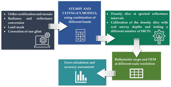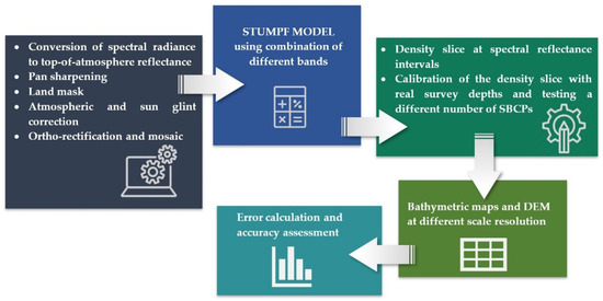 A set of Ground Control Points (GCPs), taken from the regional cartography, were used for the satellite image ortho-rectification and processed with the rational polynomial functions model. To preserve the original radiometric data, the nearest neighbor resampling method was adopted. Finally, thresholding on band 7 (near-infrared 1) was performed to mask out the land and the Stumpf SDB method was applied using 186 SBCPs distributed across the entire c.a. 4 km area and selected from the hydrographic survey dataset. The processing steps of generating bathymetric maps using SDB are illustrated in Figure 3.