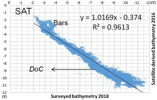 Satellite-Derived Bathymetry (SDB) fit the sea bottom between the surf zone and a c.a. −7 m depth better, while in the offshore and nearshore area it underestimated the real bathymetry. Overestimation was noticed between a −7 and −9 m depth, at approximately the depth of closure of sediment (DOC) in this area.