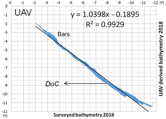 Both methods show increasing point dispersion with the depth and in the surf zone at around a 4 m depth. The latter can be explained by the fact that the bathymetric survey was performed a few days after the UAV flight and the bars were in very dynamic area with calm seas. The increase in dispersion after the depth of closure of the sediments, with a value of around −9 m for this area, must be attributed to the decreasing of the accuracy with the depth of this methodology.