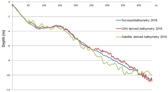 The results of the comparative analysis between the in situ survey and satellite (SAT) or UAV-Derived bathymetries produced with the Stumpf method are presented in Figure 11 for a beach profile located in the center of the study area (Figure 8a). A higher deviation of SDB than UDB from the real bottom is generally visible along with all the profiles. Both deviations also increase with the depth of the bottom.