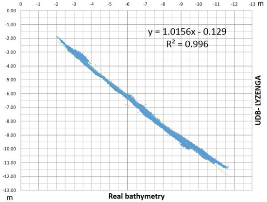 Figure 10 illustrates a scatter plot with UAV-Derived Bathymetry (UDB) and a real in-situ acoustic survey. The correlation is higher than in the previous plot, with a lower point dispersion. The higher coefficient of determination is an indicator of the better goodness of fit for the observations. This indicates a higher degree of confidence in the UDB results than SDB.
