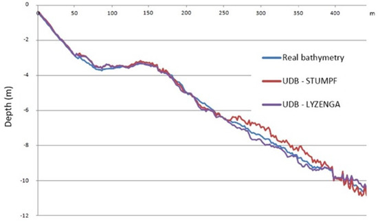 UDB with Lyzenga and Stumpf models and a real surveyed profile located in the center of the study area and perpendicular to the shoreline, as in Figure 4.