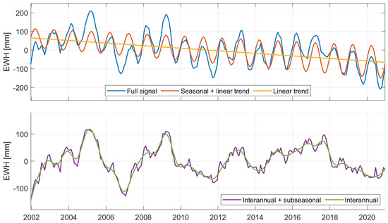 To analyze different constituents of the TWS signal, we decompose it into a long-term component, a seasonal cycle (annual and semiannual), and sub-seasonal variations. The long-term component is further separated into a linear trend and interannual variations [33,34].
