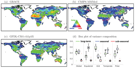 Figure 2. Distribution of the total variance into long-term, seasonal and sub-seasonal variability for the time span 2002/04–2020/04 for (a) the GRACE TWS observations, (b) the MMMed of the simulated mTWS, (c) an exemplary individual model run (GFDL-CM4 r1i1p1f1). (d) Box plot of the variance composition within the model ensemble for the global average and averaged over different climate zones. Black dots denote the respective result for the GRACE observations.
