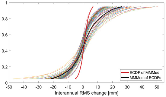 However, there is a second issue arising from building an unscaled MMMed on grid cell level: as the global patterns differ for different model runs, the median smooths out extreme values in each grid cell. Thus, the range of values in the unscaled MMMed grid is much smaller than the actual range of values in the individual ensemble members (and the observations). For illustration, Figure 3 displays the empirical cumulative density functions (ECDFs) for the 5–95% percentiles calculated from the land grid cells of all model runs for one of the measures we investigate (interannual RMS change, Section 3.2.2). Additionally, the ECDF of the unscaled MMMed is shown (thick red line), which has a much smaller range and thus cannot be regarded as a realistic representative for the variability. Thus, we adjust the range of values in the MMMed as follows: we compute the weighted multi-model median of all 105 ECDFs (thick black line in Figure 3) to obtain a best estimate for the range of simulated values, and divide it for each percentile by the ECDF value of the unscaled MMMed (thick red line). Each grid cell value of the unscaled MMMed map is then multiplied with the factor belonging to its respective percentile. As a result, the ECDF of the scaled MMMed equals the MMMed of the 105 ECDFs of the ensemble members (thick black line). Consequently, also the scaled MMMed standard deviation is adjusted by this factor. The scaling of the MMMed ensures that not only the global pattern but also the range of values states a representative estimate of the model results. Thus, in the rest of the paper, all comparisons (as far as referring to a model average) are performed with respect to the scaled MMMed. If only MMMed is written, it always means the scaled MMMed.