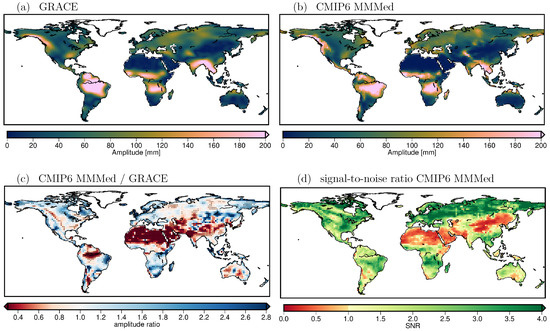 In the arid regions of Northern Africa, the Arabian Peninsula, and in large parts of China and Mongolia, the SNR is very small or even below 1. In these regions, the annual cycle is generally not very distinctive (Figure 4b), as can also be seen from the composition map in Figure 2c: the dominating component of the time series in the regions of small SNR is the long-term or sub-seasonal signal. Thus, meaningful results for the annual cycle cannot be expected in these regions. We decided to exclude regions with a SNR of the CMIP6 amplitudes below 1 (24% of the global land area) prior to a regional analysis of the amplitude deviations between CMIP6 and GRACE, because otherwise the statistical measures would be largely distorted.