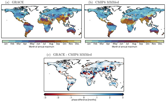 Figure 5. (a) GRACE TWS month of the maximum of the annual cycle and (b) MMMed mTWS month of the maximum of the annual cycle for the time span 2002/04–2020/04. (c) Difference of (a,b). Stippling indicates regions where the difference exceeds the standard deviation of the difference.