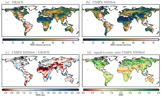 In several parts of the world long-term variations (linear trends plus interannual variations) in TWS are the dominating part of the signal variability (Figure 2). The direct comparison of linear TWS trends from GRACE and ESMs is difficult because the models do not include all physical processes (e.g., surface water, glacier, and anthropogenic groundwater change) that contribute to observed TWS, and therefore are not able to fully represent long-term trends everywhere. Furthermore, over a time span of less than 20 years trends are largely influenced by interannual variability [13], so that we focus on interannual variations only. As elaborated in Section 2.3, model time series of interannual variations are not directly comparable due to the random occurence of such variations in the models. Therefore, we chose the RMS of the interannual variability over 2002–2020 as a measure for comparison. Similarity of the RMS between models and GRACE over a 18-year time span would prove that the models are able to capture the general range of observed interannual variability independent of the exact evolution of the time series. Indeed, the global patterns of the GRACE interannual RMS and the MMMed interannual RMS (Figure 6a,b) feature similarities in many regions of the world. The global pattern correlation for the MMMed with GRACE is 64%, which is lower than the correlation for the annual amplitude, but nearly as high as the correlation of the MMMed with its individual model ensemble members ( 65 ± 15 % ), which highlights the large intermodel spread of the interannual TWS variability in ESMs.