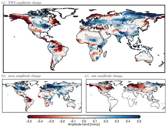 Figure 7. (a) MMMed mTWS annual amplitude change over 2000–2100. Stippling indicates regions where 13 or more of 17 models (i.e., ≥76%) agree on the sign of the amplitude change. (b,c) same as (a) but for mrso and snw.