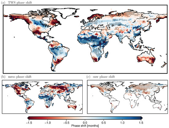 Figure 8. (a) MMMed mTWS phase shift of the annual cycle over 2000–2100. Stippling indicates regions where 13 or more of 17 models (i.e., ≥ 76 % ) agree on the sign of the amplitude change. (b,c) same as (a) but for mrso and snw.