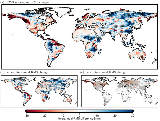 Figure 9. (a) MMMed mTWS interannual RMS change from 2002–2020 to 2082–2100. Stippling indicates regions where 13 or more of 17 models (i.e., ≥ 76 % ) agree on the sign of the RMS change. (b,c) same as (a) but for mrso and snw.
