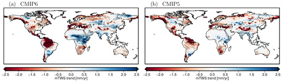In addition to changes in the annual cycle and interannual variations, the long-term linear trend affects the possible range of future TWS. Centennial mTWS trends in coupled climate models and their relation to GRACE were investigated in Jensen et al. [13] for CMIP5, and we thus give a short update on the findings for CMIP6. The centennial median mTWS linear trend (parameter b in Equation (5)) from each 17 CMIP6 and CMIP5 models is shown in Figure 10. As before, stippling indicates regions of high consensus (≥13 of 17 models agree in sign).