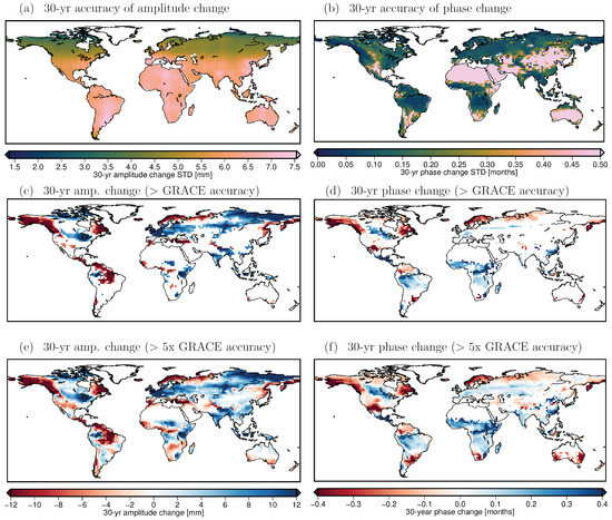 Figure 11. (a) standard deviation of GRACE TWS annual amplitude change over 30 years. (b) standard deviation of GRACE TWS phase change of annual cycle over 30 years. (c) MMMed mTWS annual amplitude change over 30 years that exceeds the GRACE accuracy (given in (a)). (d) same as (c) but for phase change. (e,f) same as (c,d) but assuming the standard deviation of GRACE (given in (a,b)) being five times smaller.