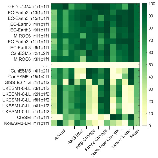 Figure 12. Ranking of the ensemble members according to the classes assigned with pattern correlation (odd columns) and RMSD of ECDF (even columns) of annual cycle and interannual RMS with GRACE (colums 1–6) and amplitude change, phase change, interannual RMS change and linear trend with the MMMed (columds 7–14). Mean rank given in column 15. The upper 10 ensemble members are the best performing, the lower 10 the worst. The full ranking table is provided in the Supplementary Material, Figure S6.