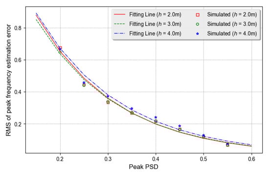 All the peak PSD samples are arranged into bins centered at eight different peak PSD values (0.2, 0.25, 0.3, 0.35, 0.4, 0.45, 0.5 and 0.55), and the width of each bin is 0.05. Each of the central peak PSD values represents all the peak PSD samples within the bin. The root mean square (RMS) of the peak frequency error within each bin is calculated. Thus, a distribution of the RMS of the peak frequency error versus the peak PSD is obtained, as shown in Figure 2, where three different antenna heights are tested. Obviously, the RMS of the peak frequency error decreases with the increased peak PSD. The RMS of the peak frequency error is marginally different under different antenna heights. However, the variation pattern of the RMS of the peak frequency error versus the peak PSD is almost the same. Using the exponential fitting produces the exponential fitting functions as: