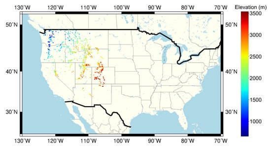 The data set used to develop the empirical model was collected at the sites of the snow telemetry (SNOTEL) network, which is operated by the Natural Resource Conservation Service (NRCS), U.S. [,]. The snow depth and SWE data collected at 612 SNOTEL sites from 1 August 2010 to 1 August 2015 are used to develop the empirical model. When the snow cover duration in a winter season is shorter than 90 days, the snow depth in the season is typically smaller than 50 cm, as observed from the data sets, and the snowpack would present irregular variation patterns, such as multiple snowfall and snow-melting cycles in a single winter season. Therefore, the data in the five years are examined to select the data according to the criteria: (a) the maximum snow depth at each of the selected site is more than 50 cm; (b) snow cover duration in a winter season is over 90 days for each of those sites. As shown in Figure 3, the elevations of the selected sites are quite different (from ~800 m to ~3500 m) although they are all distributed in the western part of the U.S.