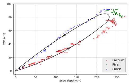The snow depth usually increases until reaching its maximum, and then it sharply decreases until there is no snow on the ground. Therefore, as shown in Figure 4, the variation of SWE versus snow depth presents a hysteresis loop and produces multivalued SWE for each snow depth in a snow season. It can be observed in Figure 4 that before the snow depth reaches its maximum within the snow accumulation period (Paccum), SWE slowly increases with the increase of snow depth. After SWE reaches its maximum, and thus, when the snow melting period (Pmelt) starts, as the snow depth decrease rate is much larger than the snow density increase rate, SWE decreases with the decrease of the snow depth. Although the increase rate and decrease rate of SWE are different, SWE is proportional to the snow depth in both of those two periods. In the period between the two days when the snow depth and SWE reach the maximum separately (i.e., the snow transition period, Ptran), the snow depth decrease rate is smaller than the rate of snow density increase; thus, SWE increases with the decrease of snow depth. Because of the significant difference in the variation pattern of SWE versus the snow depth in the three periods, it is necessary to develop three separate regression models to convert the snow depth to SWE for Paccum, Pmelt and Ptran, respectively.