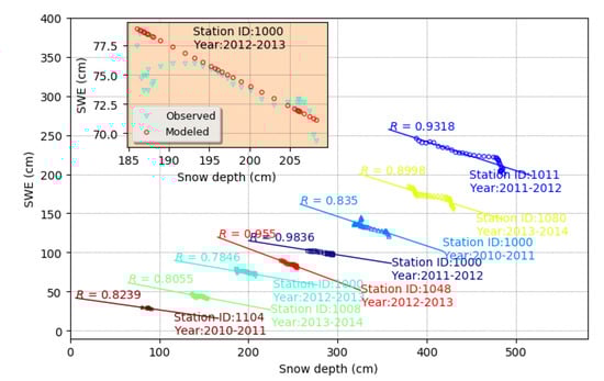 Figure 6 shows the scatterplot of SWE versus the snow depth in Ptran. For clarity, only eight results related to six SNOTEL sites are presented. Contrary to Paccum and Pmelt, the SWE basically increases with the decrease of snow depth in Ptran. The statistical results show that there is a significantly linear correlation between the snow depth and SWE in the period, and the relationship at each site can be modeled with a linear regression equation: