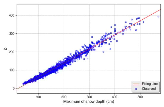 Intuitively, the parameter b is relevant to the maximum of snow depth for each snow season. This can be seen clearly in Figure 7, which shows a scatterplot of parameter b and the corresponding maximum of the snow depth of the snow season. Based on the linear distribution pattern shown in Figure 7, the relationship between the maximum of the snow depth and parameter b can be obtained by using the least squares fitting as: