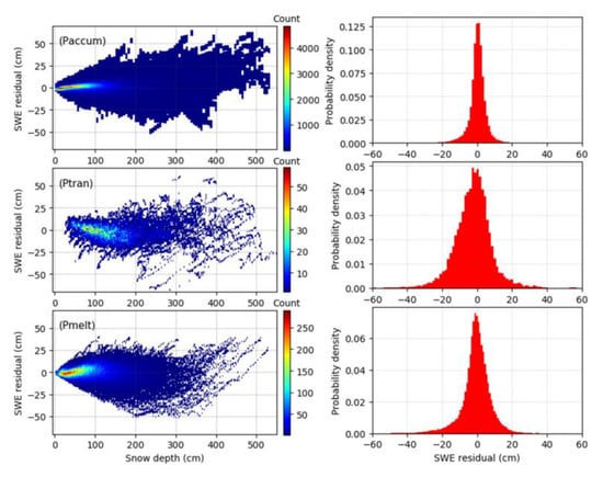 Figure 8 shows the distribution of modeled SWE residuals versus snow depth and the residual distributions for the three periods. Basically, the fitting residual of SWE increases with the increase of snow depth for all three models. The mean modeled SWE residuals of the three periods are 0.27 cm, −2.43 cm and −0.64 cm, that is, there is a bias in all three periods and the one in the transition period is significant. It can be seen from the left panel of the figure that there is a clear minor increasing trend from −3.3 cm to 5.7 cm for Paccum when SD is in the range of 0 m to 1 m, a decreasing trend from 8.9 cm to −10.3 cm when SD goes from 0.4 m to 1.5 m for Pmelt, and an increasing trend from −3.5 cm to 7.4 cm when SD goes from 0.1 m to 1 m. The reason of this bias is that the proposed model only considers the relationship between SD and SWE. SWE is affected by multiple parameters, although SD plays the most important role. It is more accurate to develop a multi-parameter (including climate parameters) model to estimate SWE, if those parameters could be obtained precisely.