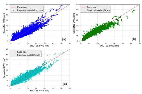 Scatterplot of the in situ SWE versus the modeled SWE estimates for Paccum (a), Ptran (b) and Pmelt (c).