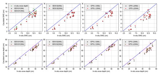 Four BDS satellites with B1 and B2 signal SNR observations and five GPS satellites with L1 and L2 signal SNR observations are used to test the proposed method. According to the snow depth records over the years in the area, the snow depth hit its maximum in February. Therefore, the empirical model of Paccum was used to convert the SNR-based snow depth into SWE. Figure 11 shows the scatterplot of the in situ SWE versus the SNR-based SWE, and the scatterplot of the in situ snow depth versus the SNR-based snow depth. Note that the SNR-based snow depth estimations, produced by two different average techniques, are presented in the figure; NA refers to the results obtained by the normal average and WA refers to the results obtained by the weighted average, which is obtained by Equation (7). Therefore, two different SWE estimations, calculated by those two different snow depths, respectively, are also produced and presented in the figure. Table 5 shows the mean, STD and RMS of errors in the SNR-based SWE estimation.