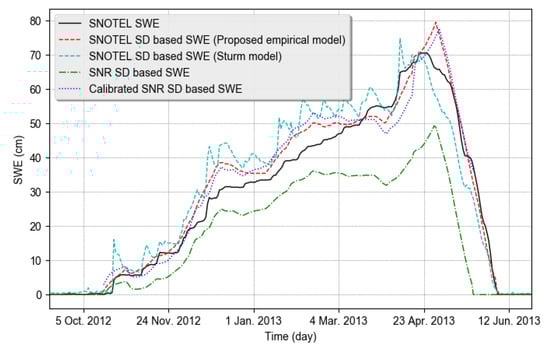 Note that, because the relationship between the SNR SD and SNOTEL SD before the maximum snow depth is different from that after the maximum snow depth, the regression analysis is carried out at those two different periods separately. In addition, because the snow depth around the GNSS station is significantly smaller than that of the SNOTEL site, the snowpack around the GNSS station already melted away on a day during the melting period while the SNOTEL site still had a snow depth between 40 and 60 cm, which needed more days to melt away. Thus, SD and SWE observations of the period are not used for calibrating. Based on the regression models, the calibrated SNR SD in the snow season can be obtained. As shown on the right of Figure 13, the calibrated SNR SD agrees well with the SNOTEL SD. The calibrated SNR SD yields a better SWE estimation, and the residuals are evenly distributed with a relatively small bias, as shown in Figure 12 and on the left of Figure 13. Through the influence of SWE empirical model error, both the SNOTEL SD-based and the calibrated SNR SD-based SWE estimations overestimate the in situ SWE in the middle of December 2012, February 2013 and early May 2013. In general, the calibrated SNR SD-based SWE estimates agree well with the SNOTEL SWE measurements.