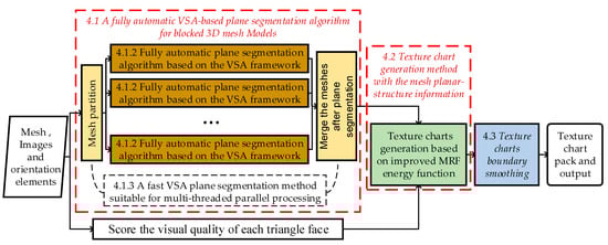 This paper proposes an improved OpenMVS texture chart generation algorithm. Improvements include: (1) adding a fully automatic VSA-based plane segmentation algorithm for blocked 3D mesh models, which uses the degree of planar approximate error change as the standard for fully-automatic plane segmentation and realizes the multi-threaded parallel processing of the VSA algorithm by partition and merging the meshes after plane segmentation; (2) modifying the smoothness term of the MRF energy function, which combines the planar-structure information of the mesh model and the visual information to generate texture chart; and, (3) providing strategies for optimizing the jagged boundary problem of the texture chart. The flowchart of our algorithm is shown in Figure 1.