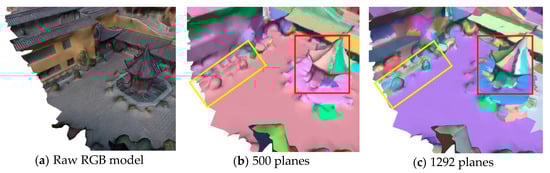 where and are the error drop ratio before and after adding a new plane. The value of is the ratio of to , where is the error sum of all current planes and is the error of the initial plane (same as ). is the difference between the and . The smaller indicates that the segmentation result is more approximate a plane. With the number of planes increasing, and gradually decrease. declines until it is less than the threshold ( in all our experiments), which then stops the addition of new planes. At this point, all the planes have been extracted, and the mesh is segmented by the planes. The segmentation result is shown in Figure 2. Different planes are marked with different colors in each picture. Figure 2a shows the raw RGB model. Figure 2b displays the segmentation results when using a fixed value of 500. Some objects are not segmented, such as roof and plants on the ground. Figure 2c presents the results when the planes are dynamically increased. Unlike in Figure 2b, the main objects are extracted appropriately.