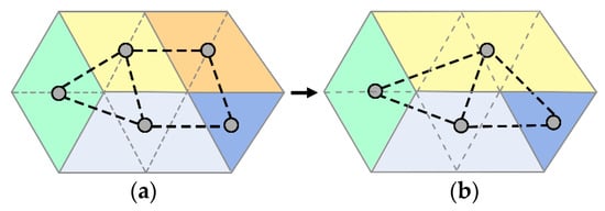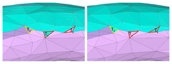 Figure 8 presents the results of boundary smoothing, where the different texture charts are represented by different colors. In the image, there are only two texture blocks around the triangles and . According to the principle of number dominance, and are smoothed to the pink and green charts, respectively. For the triangle surface , three texture charts surround the surface, which, according to the longest side principle, is optimized into the green texture chart.