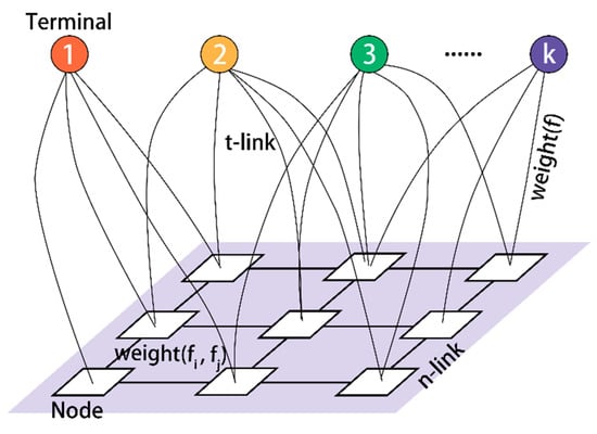 A texture chart is a set of topologically adjacent faces with the same image label. The result of the texture chart generation depends on the selected image label for each face. Typically, there is more than one visual image for each face, and choosing an optimal visual image from all candidate images for each face is essentially a multi-label graph cut optimization problem. As shown in Figure 6, we constructed an undirected weighted graph of mesh, where the number of nodes and the number of faces is equal. Each face in the surface model is regarded as a node in graph , and the edges between nodes represent the adjacent relationship between faces. There are k terminal nodes, with each corresponding to an image in the graph. The edges connecting the terminal node and common nodes are t-link, which means that the face is visible on this image. Moreover, the edges connecting the common nodes are n-link, indicating an adjacent relationship between the two faces. When considering these edges as pipelines, finding the max flow from one terminal to another terminal is a Max Flow problem. Liu et al. [54] pointed out that when the n-link edges are located in the max flow and separate the terminal nodes, the cut of these edges is the minimum cut. Therefore, this becomes a MaxFlow cut and MinCut problem.