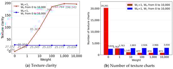 where is the visual clarity for each face on the specified image after optimization, and is the number of texture charts after optimization. As shown in Figure 7, the influence of and on the optimization effect is tested separately by the control variable method. When , , the texture visual quality increases rapidly, and the number of texture charts continuously decreases. When , the optimization effect begins to converge. When , , the texture clarity declines slowly, and the number of texture charts gradually increases. The change is not obvious. When , it would be more advisable to reduce the number of texture charts and improve the display effect of textures. In this study, we used and as the smoothness term’s value.
