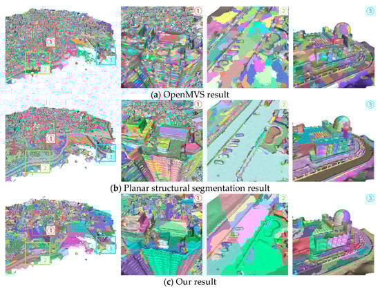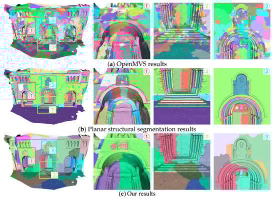 From the local zoom view, the boundaries of planer structural segmentation results are mostly located in high curvature regions of the models, such as wall corners (Church: region 1 of Figure 10; Villa: region 1 and 2 of Figure 11; City: region 1 and 3 of Figure 12) and staircase edges (Church: region 2 of Figure 10; Villa: region 1 of Figure 11), and can represent all the planes of the model well. For the results of our method, the texture charts differed significantly. In the plane region, the texture charts were further segmented by MRF energy function. In the non-planar region, A large number of planes are merged. For example, in region 3 of Figure 11, due to the undulations of roof tiles, the OpenMVS and plane segmentation results showed large numbers of fragments. In the results using our MRF energy function, the number of texture charts is significantly declined. The same observation can be made for the observatory’s dome in the City (region 1 and 3 of Figure 12).