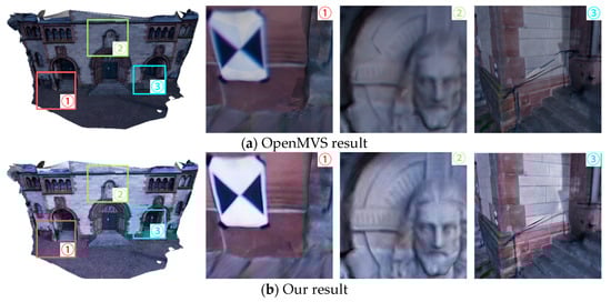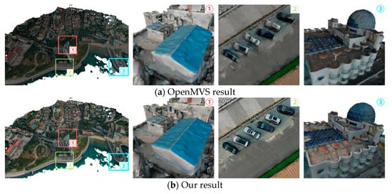 To verify the effectiveness of our algorithm, we utilized the model using different data types and images from different regions with varying numbers and angles. The experiment content includes two parts: qualitative assessment and quantitative evaluation. We compared the experimental results with the open-source program OpenMVS, which provides a complete set of processes to recover the full surface of the scene from being reconstructed. OpenMVS is an open-source method that is convenient for others to learn and improve and can be easily transplanted to other application scenarios. This experiment is modified based on OpenMVS, and the theoretical content of this study is implemented by replacing the code of the texture chart generation.
