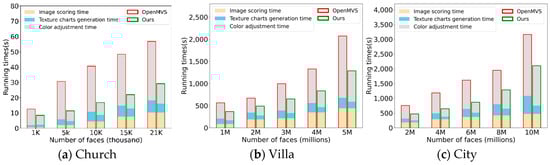 Comparison of texture reconstruction efficiency (unit of the running time is second). (a) Church running times; (b) villa running times; (c) city running times.
