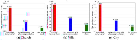 Changes in the number of texture charts generated by our algorithm and OpenMVS. (a) Church results; (b) villa results; (c) city results.