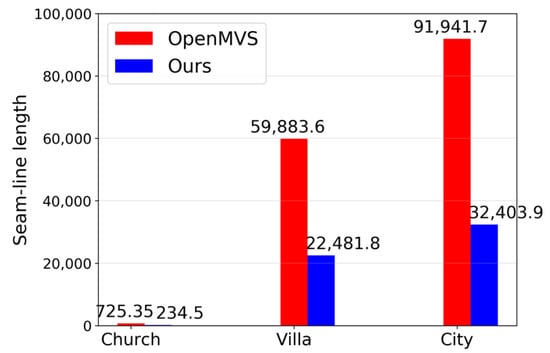 The seam-line is the common boundary edge between two adjacent texture charts. Texture color discontinuities are prone to appear at the seam-line. The longer the seam-line, the more the color errors. Calculating the length of the seam-line can effectively measure the texture discontinuity problem of texture reconstruction results. Our algorithm can reduce the length of the seam-line by reducing the number of texture charts. To verify the improvement in the reconstruction effect, we analyzed the seam-line length. The statistical results of the seam-line length in Figure 18. The seam-line length of the texture chart generated by our method is significantly smaller than the boundary length generated by OpenMVS.