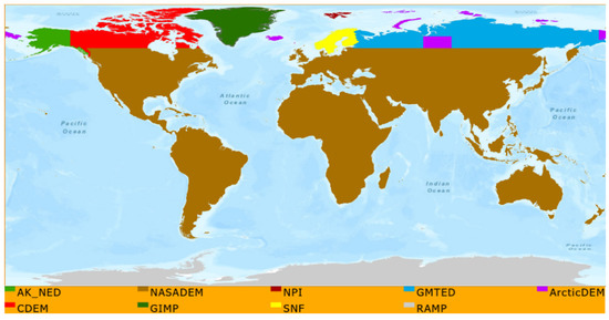 Since the release of the original SRTM dataset, several global elevation datasets such as the National Aeronautics and Space Administration’s DEM (NASADEM), ASTER Global DEM (GDEM), ALOS World 3D (AW3D) have become available to the public free of charge with a pixel size of 30 m. Accuracy assessment studies on these global DEMs have shown that the overall vertical accuracies are significantly better than the SRTM dataset, but each of these datasets presents additional challenges in terms of global coverage, voids and artifacts such as spikes and pits [3,4,5,6,7]. Using elevation sources such as ICESat and GDEM3, the NASADEM improved the vertical accuracy and removed spikes observed in the earlier version of the SRTM data [2]. However, the dataset is still limited to the range of north 60 degrees to south 56 degrees latitude and complementary elevation sources were needed for latitudes beyond this range. Although the scientific community has access to DEMs with complete global coverage, better horizontal resolution and improved relative and absolute vertical accuracies from products, such as Tandem-X DEM and WorldDEM [8,9], these datasets have license restrictions that would conflict with the current USGS policy of free reference data distribution. Therefore, the CalVal Team chose to use freely available national and regional datasets such as the Canadian DEM (CDEM) [10], Greenland Icesheet Mapping Project (GIMP) [11], Sweden-Norway-Finland (SNF) [12,13,14], Alaska-National Elevation Dataset (AK_NED), Global Multi-resolution Terrain Elevation Data 2010 (GMTED2010), NPI (Norwegian Polar Institute) [15], ArcticDEM, the Radarsat Antarctic Mapping Project (RAMP) DEM in Antarctica and NASADEM for the rest of the globe. Note that not all of these datasets are a new addition from Collection-1. The improved global elevation dataset from this study, called the Landsat Collection-2 DEM or simply Collection-2 DEM, is expected to be released by the end 2020 and will be used to process the entire Landsat archive in Collection-2 processing.