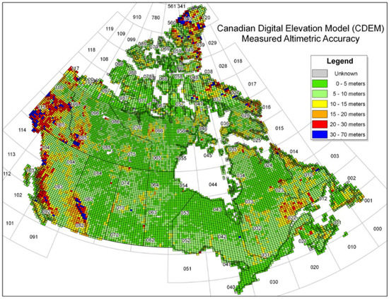 CDEM is produced by Natural Resources Canada (NRC) using an array of ground and reflective surface elevations. The post spacing varies per latitude from 0.75 to 3 arcseconds and the data are stored in geographic coordinates using the North American Datum of 1983 (NAD83) reference system. Vertical accuracy varies widely geographically, but in general is very good (see Figure 2). The dataset is vertically referenced to mean sea level using the Canadian Geodetic Vertical Datum of 1928 (CGVD28) geoid model [29].