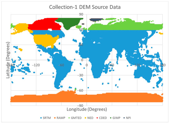 The Esri-served WorldDEM consists of the Airbus “WorldDEM4Ortho” data, an automatically generated elevation product created from WorldDEM DSM raw data, which is a hybrid between a DSM and DTM (Digital Surface/Terrain Model) [42,43]. This dataset is served at 0.8 arcsecond (approx. 24 m), and covers the entire Earth’s land surface, with pole-to-pole coverage. Access to this layer is provided as part of the Esri World Elevation Services dataset [44], through their “Terrain” layer and was parsed to only include the WorldDEM data source. Since these data are pulled from a server (as opposed to downloaded locally), changes can be made on the fly so there are many options to view and analyze. To most closely match the compared datasets, along with the base Collection-1 DEM, the format of the Esri WorldDEM data used in the study were referenced to mean sea level (i.e., Orthometric) using the Earth Gravitational Model of 2008 (EGM08) geoid.