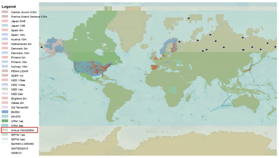- WorldDEM. Available online: https://www.intelligence-airbusds.com/en/8703-worlddem (accessed on 5 June 2020).