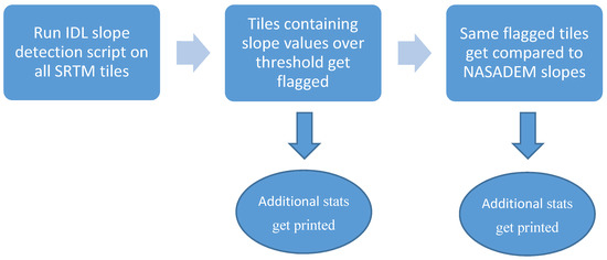 Since most of the Collection-1 DEM consisted of SRTM data, which are known to have artifacts, it was necessary to develop an algorithm to search for the artifacts rather than visually review the images. This was accomplished by using a topographic modeling tool [54] in ENVI® software to calculate slopes within the DEMs, based on the premise that irregularly high slopes found in an image are probably attributed to an artifact of some sort, like a pit, spike, or void. This tool was scripted in IDL to calculate the slope values (Equation (1)) found for each pixel in each image and create a flag if that value was greater than a threshold: