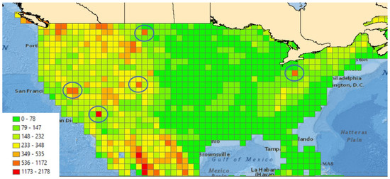 Map of maximum percent slope values found in Shuttle Radar Topography Mission (SRTM) DEM of the USA. Suspiciously high values are circled.