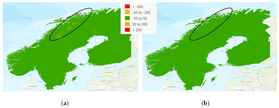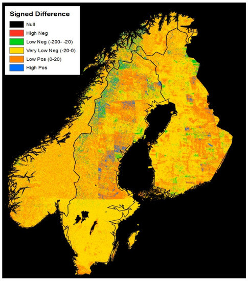 When differencing the Scandinavian (SNF) dataset against the Collection-1 DEM, a significant tiling pattern was distinguished in Sweden (Figure 10). To determine if the tile pattern was due to irregularities in the SNF dataset or the Collection-1 dataset, looking at the datasets individually and zooming into the most dramatic areas revealed that the tiling pattern lay within the Collection-1 DEM. Looking at the differenced layer (Figure 10) of the datasets also highlighted where the source data for the Collection-1 DEM dataset changed. Above 60° north latitude, not only was there the tiling artifact, but substantially more variability between the datasets was found. The variability is because above 60° north the source data for the Collection-1 DEM is GMTED, whereas below 60° north it is SRTM, which shows much more uniformity and consistency. In summary, although this tiling pattern was found when analyzing the SNF dataset, the pattern was due to the irregularities in the Collection-1 DEM source data (GMTED) for this region. As such, this substantiated that a switch to the SNF DEM for Scandinavia was warranted.