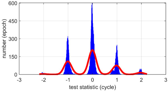 In order to reveal the mixed Gaussian distribution caused by the incorrect ambiguity resolution, we display the distribution of test statistics based on 2 days of real BDS data in Figure 2. It can be observed that the test statistics had a multi-peak feature that was inconsistent with the Gaussian distribution. Specifically, the peaks were concentrated at integers, such as −1, 0, and 1, which was mainly caused by the incorrect ambiguity resolution. Although the longer averaging length can make the Gaussian distribution assumption more reasonable, the over-long averaging length cannot satisfy the real-time requirements of IGM. Therefore, the MDE under the Gaussian distribution is not rigorous enough to express the sensitivity of the IGM, particularly in the presence of ambiguity resolution failure. It is necessary to discuss the MDE under the mixed Gaussian distribution.