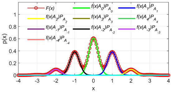 where is the Gaussian cumulative probability function, and is the standard deviation of float ambiguity in cycles. Moreover, for each failure mode Fi, the test statistic follows a Gaussian distribution with the bias of [35]. Therefore, the distribution of the test statistic is defined as a linear combination of different independent Gaussian distributions, as shown in Figure 3, and the probability density function of the mixed Gaussian distribution can be expressed as