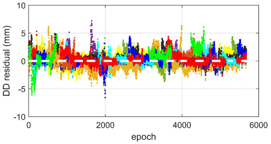 Double-difference observation residual. Different colors with dots represent the residuals from each satellite pair.