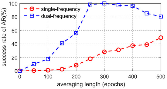 The averaging length was related to the IGM performance because the ambiguity resolution success rate was affected by averaging length. The reference for the proposed ambiguity resolution came from the output of the LAMBDA algorithm. The ambiguity resolution success rates based on the ionosphere-free combination is shown in Figure 6. Since the multiple epochs averaging method was beneficial in reducing the observation noise, we found that when the averaging length was less than 300 epochs, both the single- and dual-frequency ambiguity resolution success rates were increased with averaging length. Specifically, the best ambiguity resolution performance of the dual-frequency ionosphere-free model was obtained when the averaging length was 300 epochs. Moreover, since the cycle slip detection with the multiple-epoch ambiguity consistency check increased the probability of averaging reinitialization, we have shown that the ambiguity resolution performance deteriorated when the averaging length exceeded 300 epochs. Therefore, we chose the averaging length as 300 epochs in the following experiments.