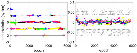 Test statistics and detection thresholds for the IGM. (Left): single-frequency IGM method; (right): dual-frequency IGM method. Different colors with lines represent the test statistics from each satellite pair; the detection thresholds are marked with the gray dashed lines.
