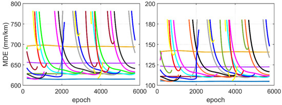 Since the MDE indicates the sensitivity of test statistics to anomalous ionospheric gradients, we tested the proposed IGM method under the fault-free and the ionospheric anomaly conditions. The dual-frequency BDS observations from 19 March 2017 to 20 March 2017 were collected from https://www.geodetic.gov.hk/sc/satref/SatRef.htm. The sampling period was 30 s, with a total of 5760 epochs. Two international GNSS service stations HKWS and HKSS were selected to form a local ground facility. The cutoff elevation angle was set as 15 degrees. The observation noise model adopted the elevation-dependent weighting, i.e., . The required false alarm and missed detection probabilities were set up to 10−8 and 10−6, respectively. The cycle slip detection was implemented with the multiple-epochs ambiguity consistency check [38].